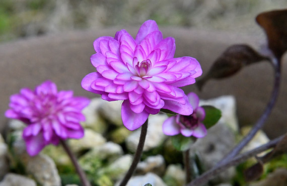 厳寒期を屋外で過ごした雪割草の千重咲品、「興野の紅」が開花しました。同期間を屋内で過ごした同じ品種は1ヶ月余り前に開花し、早々と寿命を全うしてしまいました。前年比較するなら屋外で過ごした者同士で比較するのが筋、ということで算出すると、今年は19日遅れということになります。気象条件の違いを考慮すれば、「しゃあないワナ~」という他はありません。とは言いながら、花の大きさはコチラ、屋外品の方が幾分大きい印象です。