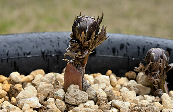 クロユリも始動しました。この品種で最後に花を見たのは2019年でした。以来5年間、この芽出しの時期までは期待を寄せるのですが、4月半ばには失望に変わる・・・というパターンを繰り返して来ました。そうした流れを踏まえて今年の芽出しを眺めると、新芽の段階での体形は幾分ズングリしている様にも見えます。・・・などといった文言を重ねると、裏目を引き当てた時のショックは倍増することになるので、ほどほどにしておきます。