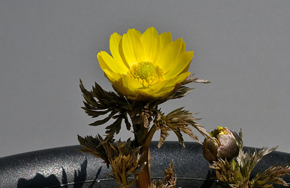 福寿草の「福寿海」が開花しました。昨年と比べて6日早い開花です。れれっ?。暖冬だった昨年より、厳冬の今年の開花が早いとは ..。経験則に照らせば、何となく割り切れなさは残りますが、これも現実です。 ・・・といった背景は脇に置いて、花の出来栄えは申し分なし・・・の美形です。見込み違いを上げれば、株の地力では期待の水準を下回ており、芽出し前に披歴した花数の期待値は達成できそうにありません。この点は昨年夏の酷暑の影響かもしれません。