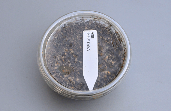 昨日に続いてウチョウランの定植です。「無銘⑤」と仮名称を付して識別している個体です。掘り出したバルブを切り替えて表示しています。ご覧の通り箸にも棒にもかからない様な小さな存在です。昨年9月に撤収した時点で、親株に当たるバルブが暑さに負けて枯死・腐敗し、取り残された子バルブだけを撤収し、冷蔵保存していたものです。 で、そそくさと定植に取り掛かります。新居として選んだのは3号(正確に言えば2.7号)陶鉢です。昨日と同じ用土で植えつけた様子がこちら。何分にも小粒過ぎて、今年は花付きまでは期待せず、リハビリに専念して貰うことにします。