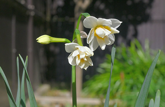 プランタの八重咲スイセンも開花しました。1ヶ月半ほど前にもこの品の開花を紹介しましたが、そちらは露地に仮植えして忘れていたものでした。前年比較はこちら、プランタ品で比較するのが筋なので、一応算出してみると28日遅れ、ということになります。暖冬、厳冬に素直に反応した結果・・・としてスッキリ受け入れられる結果です。 今年の開花時点の花軸の丈は28cmでした。目標は30cm以下だったので、4年かかりましたが、何とか達成できました。こんなことが目標になるのも奇妙なこととして映るかもしれません。それ以前の露地に植え付けていた時には、大量に梳き込んだ発酵牛糞や堆肥を吸収して、花軸の丈が60cmを超えるのが普通になっていました。スイセンが60cmを超えると、可愛さも可憐さも消え失せてしまいます。で、露地植えからプランタに移行し、一切の肥料分を絶ってダイエットに励んで来ました。そんな経緯を思うと、ここは祝杯と行きたいところですが、鬼の所業の果てにそれをするのは気が咎めるので止めておきます。