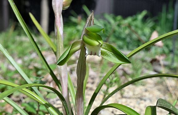 シュンランが開花しました。昨年と比べて4日早い開花です。れれっ!! 。寒かったこの冬場、随分頑張ったんだね~。この日の開花はこの1輪だけでしたが、首差ほどで3-4輪が後を追っており、今日にも後追いの開花がある筈です。 この品は2ヶ所に分けて植え付けているのですが、両方合わせて10本ほどの花軸が立ち上がっています。昨年とほぼ同じですが、昨年はこうした花軸から2個の子房が結実しました。種子で個体数を増やす必要性は全くないのですが、滅多に見かけることのないシュンランの子房が連作するとすれば、それなりに意義のあることかもしれません。