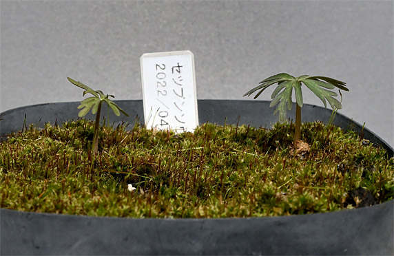 セツブンソウの実生3年株が芽を出しました。年毎に逞しさを増し、そろそろ花が咲きそうな・・・という見てくれですが、現実は厳しくそれはかなり先に話です。 逞しさを増す一方で、個体数は年毎に半減して来ました。最初に発芽を確認した2023年には少なくとも8芽が存在しました。1年後(2024年)に芽出ししたのは5芽に留まり、更に3年目の今年はこの2芽だけです。1番花は発芽から7年が目途と言われており、後4年待つ必要があります。この子たちには何としても花を咲かせるまで漕ぎ着けて貰いたいと願うばかりです。