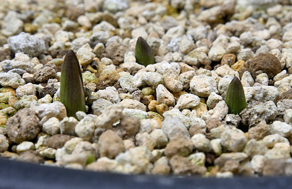 1月頃には先端から3cmほどの位置のくびれ、実はこれがツボミとなる部位ですが、そのくびれが地面スレスレの位置にありました。先月末頃からそのくびれが徐々に上昇し始め、現在3cmほどまで上昇しました。平年の開花時期である3月下旬には12~18cmまで伸びますが、今の寒気が通り過ぎれば、伸びのペースは上がる筈で、これなら平年並みか、遅くとも小幅な遅れで済むんじゃないかな?・・・などと甘い見通しを立てています。その当り外れは脇に置いて、来週には気温はめっきり春らしさを増す様で、草花の動きが活発になりそうです。と同時に、あれやこれやと芽を出さない品種の存在を眼前に突き付けられそうです。
