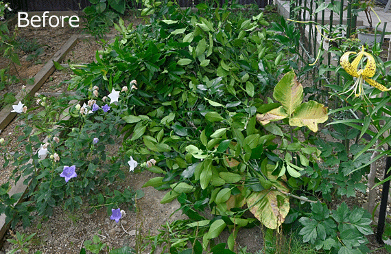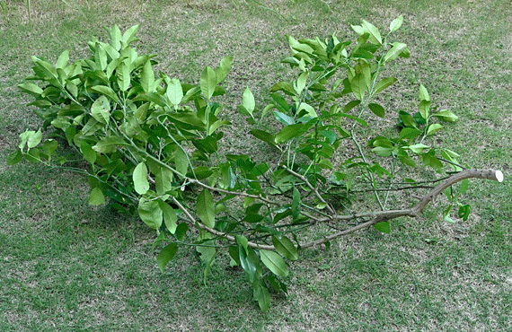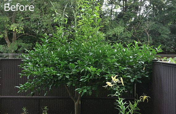 日傘代わりの文旦(雄株)の枝が、伸び放題に伸びて目障りになって来たので、少々深めに刈込むことにしました。主たるターゲットは、Before画像で上方に高く伸び上がった、7-8本の枝なのですが、日影目的なら五重、六重の葉の重なりは必要ないので上段や下段の小枝も適度に切り払うことにしました。 1時間ほどかけて目障りな枝を切り払ったのがAfter画像(切替表示)です。脚立に登って上から見て「これで良かろう」という判断を下したのですが、地上に降りて眺めると、もう一太刀刈込んだ方が良かったかも・・・という感想が沸き上がって来ました。特に右半分の上段がまだまだ目障りで、後日改めて小枝の切り払いにトライしてみます。