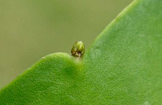 1週間前にサボテン「月下美人」の植え替えをこの場で取り上げました。以来、連日の炎暑が続いていますが、幸い植替えに伴うストレス症候群を発症することもなく、元気に過ごしている様に見えます。 その「月下美人」に、ツボミか?と思われる突起が出て来ました。突起の現在の大きさは太さ1mm、高さ1mmほどの存在で、裸眼では識別もできませんが、マクロ撮影した画像を拡大表示して、やっとそれらしい・・・と結論付けた次第です。栽培指南サイトの掲載画像によると、3mmほどになれば形や色彩から確実に判定できるらしいのですが、そうなるまでには、まだ1週間以上待たされそうです。