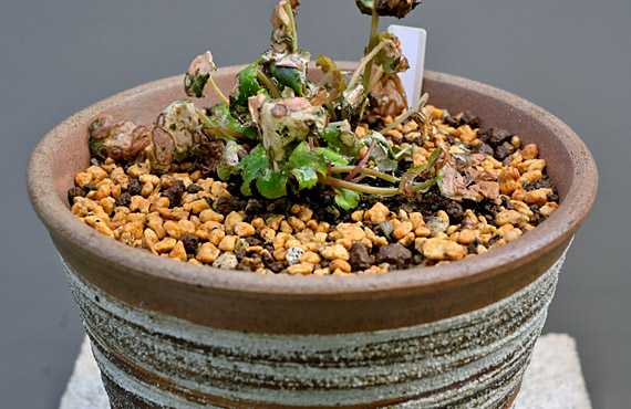 昨日取り上げた大文字草「瀬戸翠」を屋内に収容するに当たり、枯死した大量の枯れた葉が何とも見苦しい・・・という現実にぶつかりました。で、もう一度取り出して、枯れてしまった葉や葉柄を刈り払うことにしました。 こちらが散髪を済ませた状態です。枯れ葉に覆い隠されて株の中核部(=成長点)は視認できませんでしたが、これでしっかり見通せる様になりました。屋内収容により最高気温は10℃近く下がることになり、上手くすれば花の時期までに葉の構成はかなり充実するかも・・・などと期待しています。