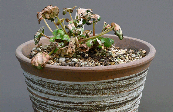 今週初め、ラックの奥側のポットを取り出そうとして、隣接するポット(上画像 = ダイモンジソウ「瀬戸翠」)に触れてしまい、落下・転倒させてしまいました。その結果、用土が少量ですがこぼれ出し、ポット端面に最大2cmほどの隙間ができてしまいました。このままでは現下の猛暑・乾燥には耐えられない・・・との判断から、簡易的にはなりますが植え替えを行うことにしました。 ポット端面に隙間ができたのは、転倒した際、用土全体が浮き上がってできた底部の隙間で鉢底石が動いて偏りが生じ、浮いた用土が元の位置に戻れなくなったのが原因のようです。こうなると鉢底部分は「0」からやり直すことが必要・・・ということで、この部分は全面的に更新しました。主たる用土は、幾分根が回り始めていたため、大崩れはせずに形は維持していました。で、この部分はそのままポットに戻し、周囲の隙間に新たな用土を充填して手直しを終了としました。その様子がこちらです。葉枯れが進行していますが、屋内に収容して花期の11月までに減った葉の回復に当らせることにします。