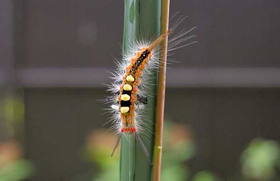 本年3番手の賊が発生しました。体長4cmほどで、体色は全体として鮮やかなオレンジに背中の黒線一筋が非常に鮮やかです。全身に白いトゲがあり、頭部、尾部、両側部に加えて背中にも白い4個の毛玉を配しています。毒々しいいで立ちに、幾分逃げ腰で撮影を済ませたのが上画像です。 早速いつもの毛虫芋虫幼虫図鑑サイトに当ってみると、「ヒメシロモンドクガ」であることが分かりました。毒蛾の名を有する毛虫というのは穏やかではない・・・ということで、更にググってみると、人体に害を及ぼす毒性はないそうです。ただ、背中の毛束は皮膚に触れる(刺さる)と軽い痛みがあり、この感覚が「毒」と感じたことから命名されたのではないか、という注釈がありました。何はともあれ、有難がるような存在でもないので、速攻で退場して貰いました。