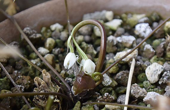 この半月ほどの冷え込みで、一旦は動き始めた早春の草花がすっかり委縮してしまい、動きが止まってしまったようです。その一つがこのセリバオウレン(芹葉黄連)。1/10に開花した1番花とほぼ同時に花軸を”つ”の字に曲げてデビューしたのですが、固い苞葉から頭(ツボミ3個)がなかなか抜けられずに、2週間近くを過ごしてしまいました。苞葉の締まり具合が固かったというのとも一因として上げられると思いますが、一番大きい要因は気温の低下だろうと疑っています。先般取り上げた雪割草などもフリーズしたように、動きが緩慢になってしまいました。 こういう風に、万事が超スロー再生のようにゆったりした動きになっています。この状態は寒が明ける2月まで続きそうですが、それに歩調を合わす様に花の持ちが伸びているのは驚きです。10日に開花した1番花も、容姿は幾分衰えたもののまだまだ健在です。画像のツボミも苞葉の中に白いものを視認して既に1ヶ月近く経つ訳ですが、今もこの状態です。ご長寿ぶりは実に見上げたものです。