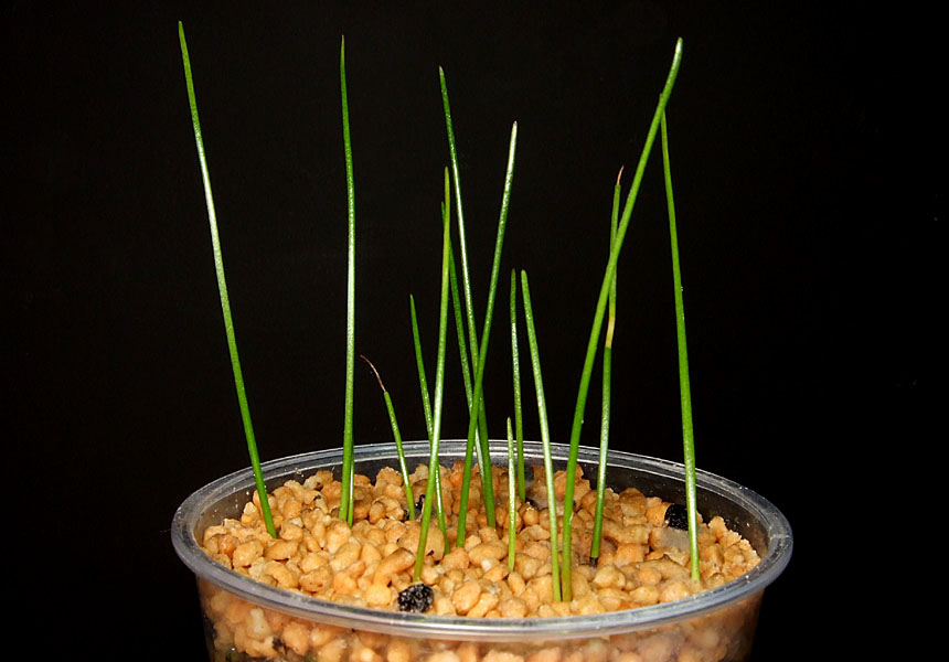 温度と光量確保のために、40W電球を15cmの近距離から照らして、寒さを凌いでいますが、その効果もあってかすくすく成長しています。最も成長の速いものは、草丈6.5cmになり、2枚目の葉が顔を出した株もあります。発芽の時点で心配したように、大寒の頃植替え・・などという、面倒なことが現実味を帯びて来ました。