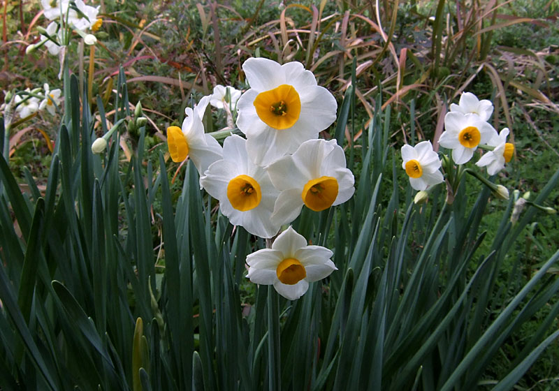 庭先や公園の花壇で、更には野辺の自生地で、スイセンが開花し始めています。左の画像は、とある棚田の石垣脇で咲いていたものですが、冬枯れの寂しい草むらで、そこだけ明るさが感じられます。