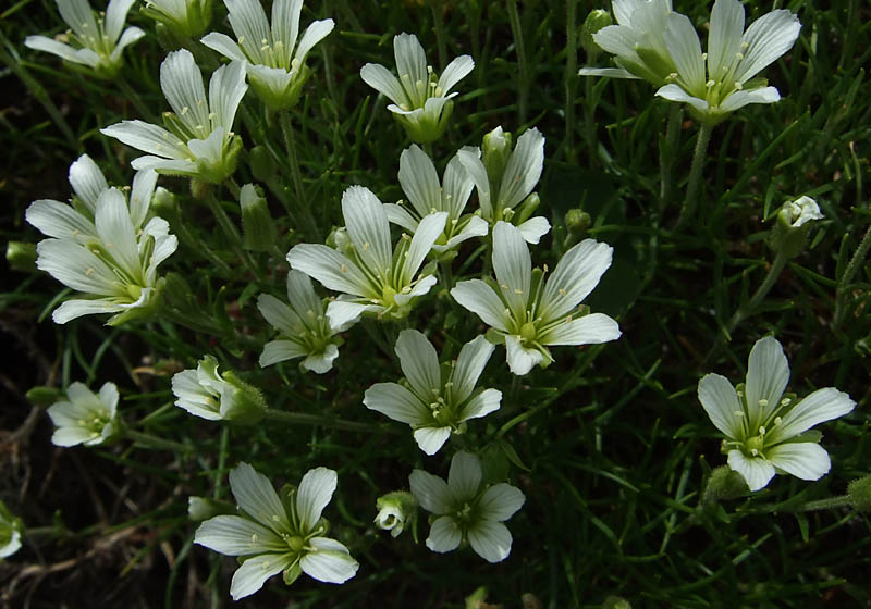 下は鹿島槍への稜線で見かけたタカネツメクサで、乾燥したガレ場でしぶとく頑張って咲いていました。派手さはありませんが、全員(?)揃って、真っすぐに上を向いている様子が、微笑ましくてレンズを向けてしまいました。