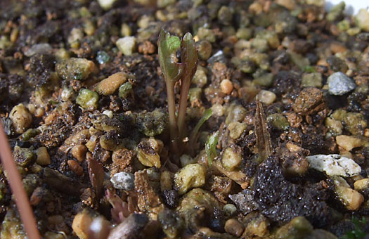 こちらはフライングではなくて、単なる寝ぼけで芽を出してしまったツリガネニンジンです。何に驚いたか、この寒空で目を覚ましてしまい、ゾロゾロと10芽ほどが顔を出してしまいました。夏草だけあって寒さには激ヨワ(弱)で、今頃顔を出してしまっては遠からず凍死は避けられません。この結果、株の地力はかなり削がれると思いますが、地下の塊根はかなり巨大