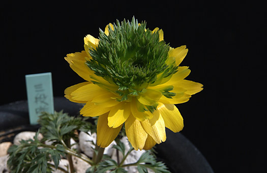 大寒を迎え、冷え込みの底で福寿草・三段咲きが開花しました。といっても今はまだ一番外側の花弁が開いただけで、この品種の持ち味であるシベが弁化した中心部は、まだ球状に硬く締まった状態です。これらが全て開いて、完全な状態( コチラ がその様子)になるまでにはもう少し時間がかかりそうです。