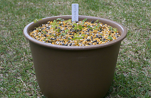 | 2ヶ月前発芽を確認して歓喜に包まれた(チト大袈裟・・)セリバオウレン(芹葉黄連)ですが、ここに来て2枚目の本葉が出揃い、3号プラ鉢は過密状態を呈して来ました。このままでは次なる成長の足かせになりそうなので、少し冒険になりますが凡そ半分を新居に引っ越させることにしました。 間引き・・・といっても、この2ヶ月で草丈(2~3cm)の2倍を超える深さまで根が伸びていました。竹串を差して用土を解し、何とか根がダメージを受けないように抜き上げて、新たな5号プラ鉢に植え替えます。作業には慎重を期したつもりですが、 新居 に定着するかどうかの結果は1週間ほどで出ると思います。暫くは直射日光を咲け、重点的に水遣りを行いながら、用土への定着を待つことにします。 |