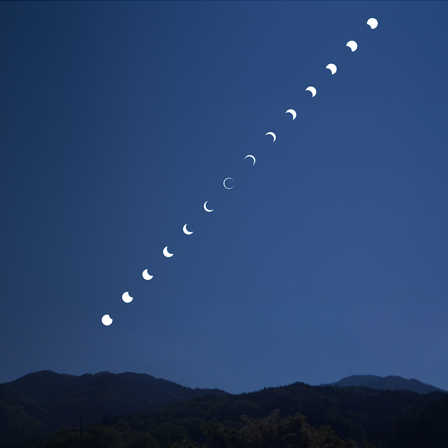 先般の金環食狂想曲に便乗して観察に出掛けた際、掛け始めから終了までのほぼ2時間半、5分間隔で撮影しました。多重露光はしていませんが、もし多重露光していたら・・・という想定で合成したものが上の画像です。表示している範囲(時間)は、6:30から8:40です。