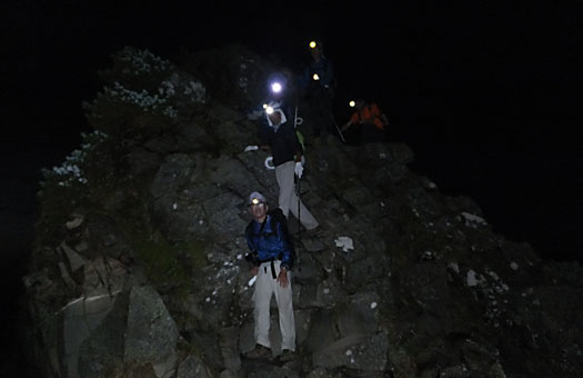 を望むことができます。ここから先は登山装備なしの客は侵入禁止というアナウンスが流されています。稜線上の山荘までは、前半は穏やかな起伏の山道ですが、後半は一気に勾配も急になります。高度差200mに所要時間1時間余りかかって、1日目宿泊先の西穂山荘(上画像=標高2366m)に着きました。 山荘で宿泊手続きを済ませ通された部屋は8畳の部屋で、混雑時には18名収容という部屋に、この日は5人の客が割り当てられました。山荘の計らいか、相部屋となった5人は全員同じ縦走を目指す客でした。その日は、互いの山の経験などの話で盛り上がりましたが、翌朝は3時頃起床、4時頃出発ということでタイミングを合わせて、8時には眠りにつきました。 さて、本番の朝です。3時少し前に誰かがトイレに立ったのを契機に、全員起き上がって準備に取り掛かりました。寝具を片付け部屋を出て、素泊まり客の自炊のために解放されたレストランで軽く朝食を済ませて、相部屋となった5人揃って3:53に出発しました。上空には高層の薄い雲がかかっていて星は僅かしか見えませんが、この手の雲は日中には消えるものです。 真っ暗な中での出発なので、全員ヘッドランプを点けての” ちょうちん行列 ”になります。のっけから急勾配のコースですが、それでも二足歩行が可能な勾配です。前方にも後方にも、別のパーティのライトが点々と続いて、季節外れのホタルの行列のような眺めです。呼吸は乱れますが、5人が塊りになって歩くこと1時間余りで、最初のチェックポイント・西穂独標(下画像)に着きました。この頃、空は僅かに白み始めていましたが、まだランプなしで歩ける状況ではありません。それでも目を凝らせば進行方向右手に奥穂高岳や前穂高岳、左前方に笠ヶ岳のシルエットが確認できます。 |