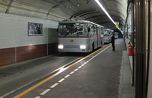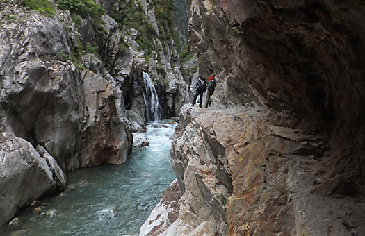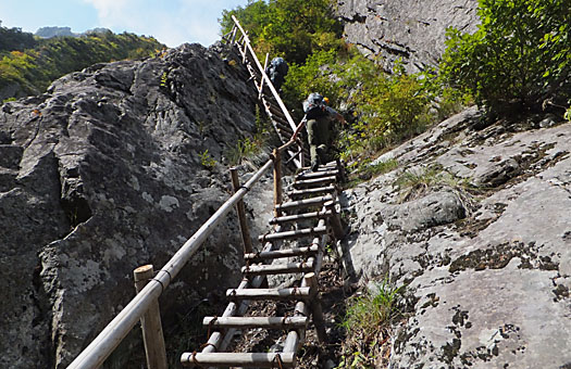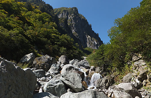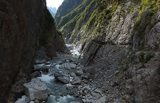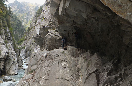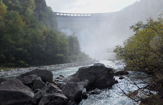 | 十字峡を後にして10分ほど進むと昨年10月に大崩落を起こした現場に差し掛かります。幅30mほどの岩盤がスッポリ抜け落ちるように崩れてしまい、長い間通行できない状態が続いていましたが、関係者の尽力で上画像のような桟道が取り付けられ、通行が再開されています。 その後も掘削路は 延々と続き ます。黒四ダムまで残り10kmほどのところが 白竜峡 と呼ばれるエリアで、黒四ダムから下流ではこの辺りの川幅が最も狭くなっており、川幅は10mを切るようになります。ここに来て黒部本流の流れが次第に白濁し始めました。十字峡を通過した頃には、きれいに澄み切っていたのと比べると様変わりです。原因は黒四ダムの観光放水が始まった影響のようです。白竜峡通過後も 掘削路くぐり や崩落しそうな現場を 高巻き で迂回する苦難のコースは延々と続きますが、通路と谷底の平均的な高度差は10m前後まで縮んで来ました。 本流に流れ込む大きな支流、 内蔵助谷 との合流点まで来ると、黒四ダムまでは1時間半を残すだけになります。ここで昼食を兼ねて少し長めの休憩を取ることにしました。ある人は調理を始めるし、ある人は沢水でタオルを濯ごうとして嵌ってしまう(深さは膝上ぐらいでしたが・・・)などと、40分ほどリラックスした時間を過ごし、最後の歩きにかかりました。40分ほど歩いたところで、対岸の山腹に人工の施設が目に入るようになります。更に20分ほど歩き、本流の屈曲部を通り過ぎたところで、巨大な黒四ダム本体のシルエット(下画像)が目に飛び込んで来ました。一同(5名)から歓声が上がります。ダム本体から500mほど下流で、本流に架かった橋を渡りますが、観光放流の飛沫が雨のように頭上から降り注いでいました。 河原からダム堰堤までは高度差200mほどの急登をこなさなくてはなりません。長い間水平歩道を歩いて来た足腰は、平地歩きに馴染みきってしまったのか、この最後の急登は実に応えました。太腿が攣りそうになるのを宥めつつ歩くこと30分、案内板の示すままトンネルに導かれて、 トロリーバス を見掛けたところで、今回の歩き旅は無事に終了しました。 今回行動を共にしして来た方々とは、それぞれ行き先が異なるので、ダムの堰堤上まで移動したところで別れました。この方々はルートの途中で出会って、何となく一緒に行動して来たのですが、お陰様で実に楽しい山旅になりました。この場を借りて改めて御礼を申し上げたいと思います。 ≪前の記事 |