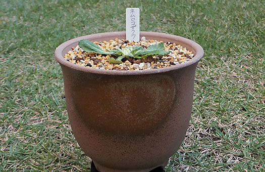 も同時に調達しました。 当日中に全てを定植はできませんでしたが、取り敢えず1点、ネムロコザクラのみを定植しました。塩ビポット内はかなり根が回っていましたが丁寧に解して、常用の用土で 4号陶鉢 に植え付けました。何とか無事に定着しますように・・・・ 残りの苗と、種子2点は今日中に処理するつもりです。 |