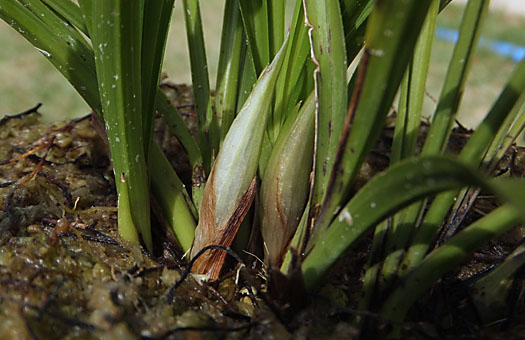 | 今回は日本シュンラン(春蘭)・「天紅香」の手入れです。現在のポットに植付けて2年経ちました。表土に被せていたミズゴケは、当初はベージュに近かった色が、コケの幼生で黒褐色に変わってしまいました。このまま放置すると、暖かくなる頃には一面ゼニゴケに覆い尽くされてしまいます。もう一つ、画像の左に見えている3芽は既に成熟期を終えて枯れるのを待つだけなのですが、思い切ってこれを切除することにしました。 手入れに先立っての観察で、来春開花する花芽が 3芽確認 できました。我が家にやって来て数年(詳しい年数は忘れてしまいました^^;)、やっと日の目を見ることができそうです。花芽を傷付けないよう、慎重に用土を排出しましたが、特段用土の疲労はなかった様子でした。次に古株の切除ですが、想像以上にバルブの結合が固く、切り離しには骨が折れました。 ポットをきれいに洗浄した後、常用の配合比の用土に固形培養土を加えたもので植え戻し、表面に新しいミズゴケを張って 作業を終了 しました。作業の過程で花芽へのストレスはなかった筈なので、来春への心配は必要なかろうと思います。半年後が楽しみです。 |