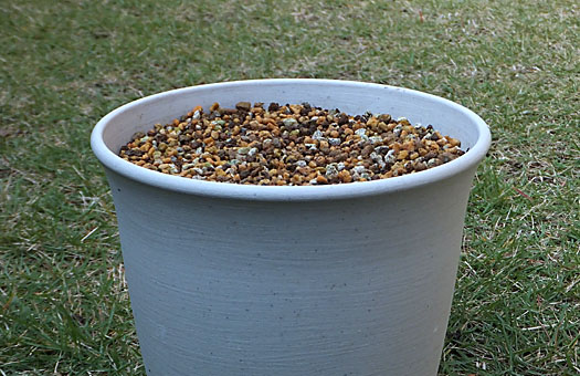 )。気分が重くなる原因は、種を蒔いて既に7年、未だに花を見せて貰っていないことです。あ~ア(溜息) それはそれとして、用土は一見して健康そうな色合いです。ただ部分的にゼニゴケが広がり始めているので、これに歯止めをかける意味で表土を若干剥ぎ取って、新しい用土に入れ替えることにします。ついでに化成肥料を適量補充することにします。表土剥ぎ取りのプロセスで確認したのが、円内の越冬芽で、年を重ねる毎に大きくなっているのですが、これで花を付けるのにまだ不足があるのかねー・・・ ・・・・・ということで、予定の作業を一通り実行した状態が下の画像。来年花がどうなるかは「神のみぞ知る」ところですが、ここまで長期間付き合って来た以上、結果を見るまでとことん付き合ってやるか... |