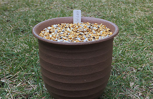 | 今回は在来種のイカリソウ(錨草)を手入れします。現在実生4年目に差し掛かったところですが、発芽した数株を2年目に植え替え、その中から生き残った1株であるため、今の株はポットの端に寄った場所で成長してしまいました。今回は用土の更新とともに、株をポットの中心に移動させることにします。 葉っぱはまだ元気で青々と茂っていますが、植え替えには邪魔になるの上に、長くとも半月から1ヶ月のうちに枯れるものなので、思い切ってバッサリ刈り払ってしまいました。すると隠れていた表土が顕わになり、ゼニゴケの侵食が始まっているのが確認できました。用土を全て排出すると、かなり根が回っていましたが、これをフォークで掻き分けて不要なヒゲ根を排除しました。その上で株を元の4.5号陶鉢の中心に置き、いつもの用土で 植え戻し ましたが、そう遠くない時期に過密状態になるのは避けられそうになく、1年後には株分けを伴う植え替えが必要になりそうです。 |