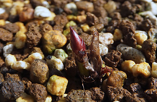 地上部は定植後2ヶ月ぐらいまでは健康そのものでした。これなら無事に定着したものと安心しかけた矢先、葉っぱが赤銅色に変色し始めました。葉焼けです。日射時間は早朝の1時間以内という特待席を割り当てていたのですが、短時間といえども強烈な日差しには耐えられなかったようで、秋口には黄変して枯れてしまいました。枯死か?・・というとそうでもなく、茎や根は生きているようで、 越冬芽 はキッチリ用意されています。これなら春には何とか花芽や新葉が顔を出すかもしれません。復活を信じて、枯葉を刈り払って半年後を待つことにしました。