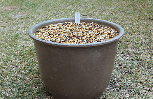 (蝮草)の植え替えです。 画像は地下の芋を掘り上げた状態ですが、春に芽出しした時点の数と変化はありません。大きさは左の大きいものでピンポン玉ぐらいです。芋のサイズに関する限り、ここ数年殆ど変化はありません。理由は暑さに負けて、盛夏を前に早々と葉や茎が枯れてしまうため、大きく育つだけの栄養が取り切れていないためと考えられます。肥大化しないことはポットで栽培する上では都合がいいので、特段の対策は取っていませんが、マムシグサの立場に立てば甚だしい冷遇と映るかもしれません。それはそれとして、いつものように常用の用土に固形培養土、化成肥料を混ぜて植えなおしたのが コチラ 。この状態で2年ほど我慢して貰うことにします。 |