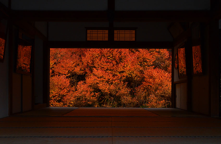 夕方5時頃本題の安国寺に戻って、撮影にリトライしました。その結果の一部が上の画像で、結構気に入っています。寺では庭に面した戸を全て取り払い、見学者に開放しています。5分交代で本堂内に来客を入れて間近で眺めたり、完全に無人化して外から本堂越しにツツジを眺め(撮影)させる・・・というスタイルを徹底して実行しており、客もその指示に忠実に従っています。そのため見学者が大勢でも、少し待っていればベストポジションに立つことが可能で、画像もそうした時間待ちを経て、外から写したものです。ライトは2灯だけのようで光量はやや物足りませんが、カメラの感度を実用域の上限まで上げて、何とかブレを押さえ込みました。