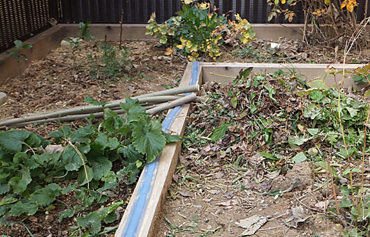 | 花壇の改修工事2日目。昨日紹介したフヨウと並んで、景観を貶めているトマトの撤収です。このトマト、植えたものではなく、去年落花した実から発芽したものです。遡れば苗を植えたのは一昨年のことで、この時は接木苗でした。その実が地に落ちて昨年数株発芽して、この年は平穏に実を付け、2株で200個余りが収穫できました。それが今年は連作ということになり、枝振りは広がり続け、花は咲くものの一向に結実しませんでした。これが連作障害というものか・・・などと納得させられながら秋を迎えました。ここに来て、いくらか実を結ぶようになりましたが「時既に遅し」で、赤く熟することはありませんでした。結局畑の養分を無駄に消耗しただけで終ってしまいました。 来年、もし自然に発芽するものがあっても速攻駆除するぞ、などと家訓を構想しつつ全て刈り払い、ついでに堆肥化を早めるために2-3cmに裁断して作業を終了しました。この2日間で、 眺め は幾分よくなりました。中央やや右にコンモリ盛り上がった部分が、フヨウとトマトを切り刻んだもので、春までにいい有機肥料に化けてくれる筈です。 |