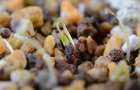 | 10日前に発芽を確認したセツブンソウですが、種子の殻を脱ぎ捨てるのにかなり手こずっている模様です。画像の固体は1/3ほどまで抜け出したところで、葉っぱの膨らみに引っかかってしまい抜き差しならない状態に陥っています。人間の行為に置き換えると、サイズぴったりでくるぶしまである靴を、手を使わずに指や足首の関節の運動だけで脱ぐようなもので、そうそう簡単に脱皮(?)できる筈はありません。しかも時間が経つと自分自身はだんだん大きくなる一方で、殻の方は次第に干からびて縮んでしまうため、作業の難航は避けられません。 とはいうものの、何ごとにも要領のいいヤツというのがあるようで、遅れて発芽したのも拘わらず、既に 6~7割脱皮 に成功したものもあります。この子の場合、あと1日か2日で殻から卒業できそうですが、その他大勢の面々(現在14芽確認済み)が全員卒業できるのは立春の頃になるかもしれません ^^。 |
