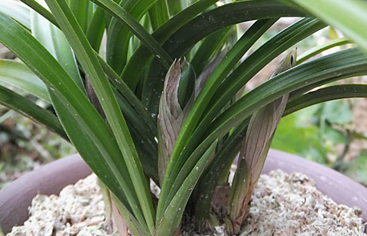 印象だったので、花の終わりを機会に思い切って植え替えを兼ねて株分け行うことにしました。 枯れた花芽を切り取り、老化の進んだバルブや枯れた葉っぱも切除した上で、2分割します。幸いなことにさほどの力仕事にはならず、分割することができました。両者3芽ずつの文句の付けようのない仕上がりです。新しく調達した4号ラン鉢(プラ鉢ですけど^^)に植え付けて作業は終了(上画像)です。虫のいい願望ですが、各々のポットに1芽か2芽の新子が顔を出してくれれば嬉しいのですが、こればかりはそんなに都合よくはことは運んでくれません。期待を繋ぎながら初夏の新子の季節を待つことにします。 |