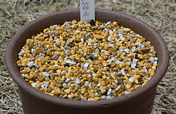 作業を始める前にポットの表面を注意深く見回すと、既に芽出しは始まっていました(円内)。まだ赤玉土小粒の陰に隠れるほどの小ささですが、屋内に入れた効果は出始めていました。この花芽を傷つけぬ様、柔らかい塩ビの板で表土を4~5mm剝がし取った上で、少量の化成肥料を散布して、減った分の用土を新たなものに置き換えます。作業を完了した様子が こちら 。開花は節分には間に合いそうにありませんが、とにかく開花に向けての舞台づくりはできました。
