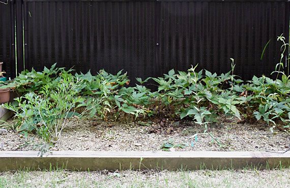 画像で長く伸びたのはチガヤで、画像に映っているものは、長屋の共有エリアからフェンスの隙間をすり抜けて葉を伸ばして来たものです。このイネ科の雑草は一旦根付くと根本から駆除するのは困難な難敵らしく、今回も地上部を刈り取るくらいしか処置の手立てはありません。空しい話ですが、この先、定期的に地上部を刈り払う作業が欠かせないことになります。