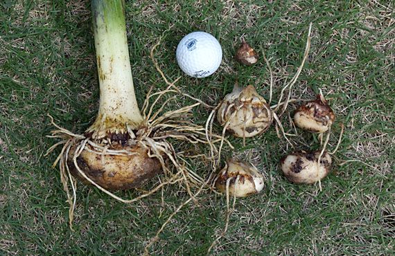この花壇の土壌は粘土質で、乾燥するとカチカチに固まる傾向があります。これでは土を掘るのも大汗ものなので、前日からたっぷり水を撒いていました。念には念を・・・ということで、作業前にもう一度散水して作業にかかります。株の周り半径20cmほどの位置を、深さ20cmまでハンドショベルで根回ししましたが、芋は上半分しか現れません。これ以上を手掘りするのは手間がかかり過ぎるので、大き目のスコップを足で踏み込んで一気に掘り起こします。掘り上げたものを軽く水洗いして土を落した様子が こちら 。左端の1番大きなもので大人のゲンコツぐらいで、これが植え付けた時の本尊だと思うのですが、3~4年で1.5倍ほどに肥大化していました。他に分球で増えた小芋5個も出て来ました。これらを近日中に手頃な森に移植することにします。