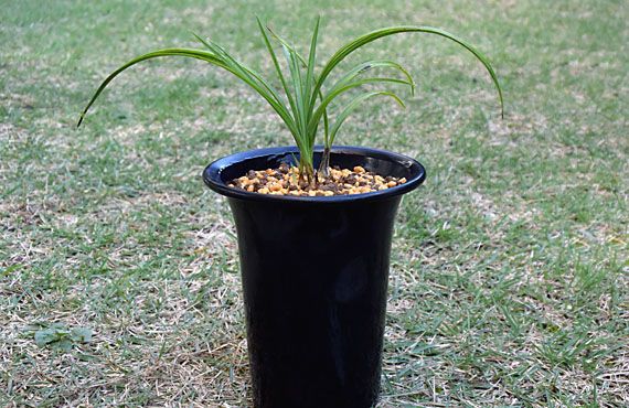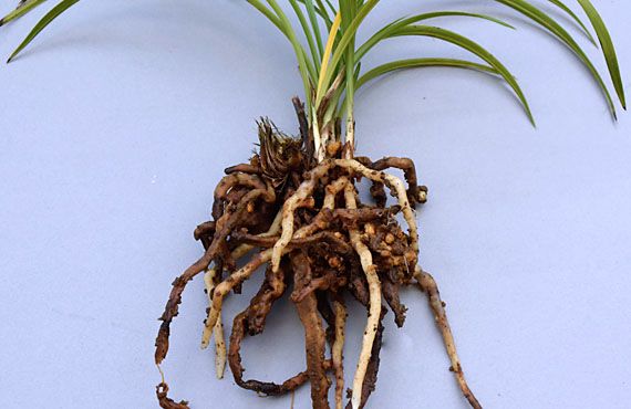 全体を掘り上げた様子が こちら 。左半分弱の黒く変色した部分が枯死した部位ですが、1ヶ所に集中しているので、さほど労力もかからずに劣化部位は除去できました。右半分の生存部分でも劣化した根は切除した上で、植付けに取り掛かります。ポット底部に中粒の用土を、上部に小粒用土を用いて植え付けた様子が こちら 。ポット内は枯死株3株もなくなり、随分スッキリしました。但し、残念ながらこのポットには花芽の兆しはなく、来春も作落ちが続きます。