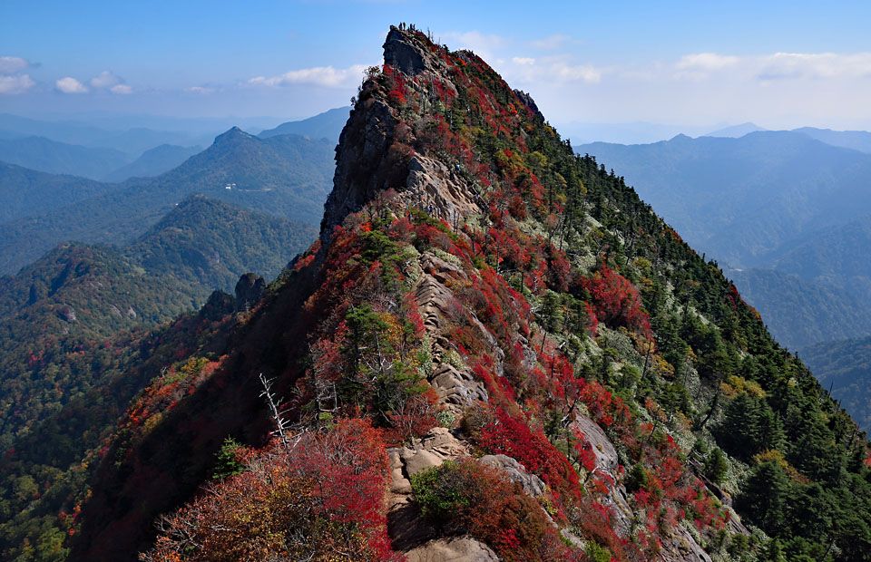 夜明峠を過ぎると、いよいよ石鎚本体に取り付くことになり、勾配はさらにきつくなります。加えて、よく整備されたコースには鉄製の丈夫な階段が多く敷設されていて、これが軟弱化した筋肉に疲労も重なって、ピッチは更に低下してしまいました。弥山山頂の神社に到着したのは、12:50になっていました。ここから天狗岳を見た紅葉の様子が下の画像です。既にピークは過ぎた様で、ロープウェー売店で売られている写真や、Webで紹介されている作品群と比べると、紅葉の濃度というか密度はかなり見劣りが否めません。もし次に来る機会があれば、もう1日か2日早く来ることにします。