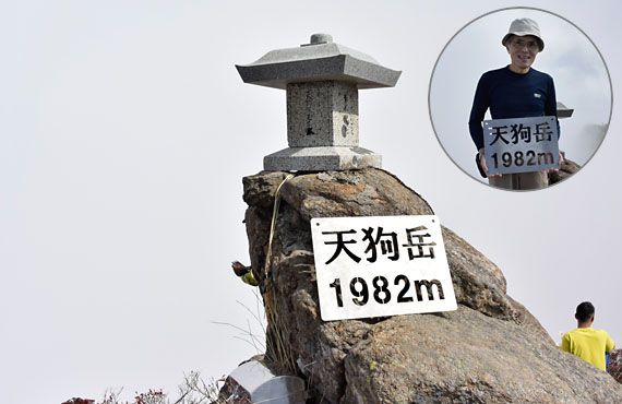 残るは主峰・天狗岳へのご挨拶だけです。多勢の登山者が作る行列に加わり、馬の背のような狭い尾根を辿ります。10年ほど前に来た時には、この場所ではもっと恐怖感があったのですが、あっちこっちの危険ポイントを巡礼している内に、次第にこうした場所に慣れてしまった様です。150mほどの岩尾根を進んで天狗岳ピークに到着。近くにいた山ガールにシャッターをお願いして記録も残して、本日の全目標を達成(下画像)。