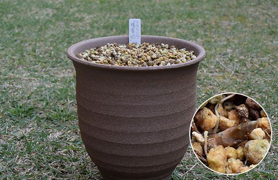 茎の太さは根元付近で0.5mmから太いものでも1mm程度ですが、半年間の年期でかなり固くなっています。これを用土の表面ギリギリで切り払ってしまいます。要点は「地上にはみ出したヒゲ根は切ってもいいが、越冬芽は絶対にキズ付けないこと」ぐらいです。慎重に作業しても 数分で終わって しまいました。地上部が丸坊主になると、葉陰に隠れていたダンゴムシがよく目立ちます。で、コヤツらには特効薬のデナポンをご馳走してやりました。明日にはダンゴの山が見られる筈です。