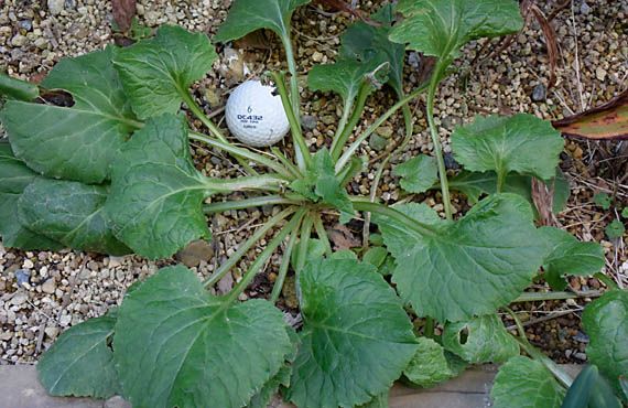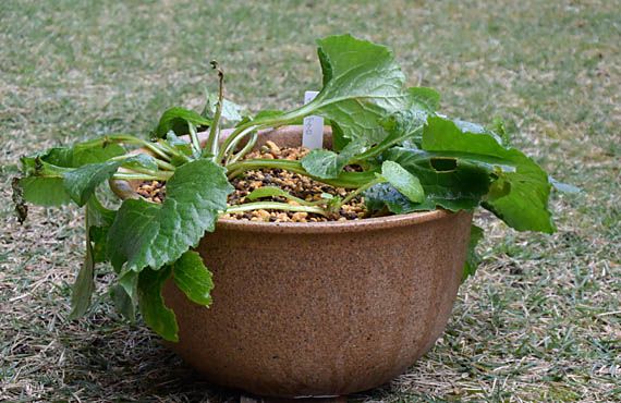 移動を済ませたポットの様子が こちら 。今は巨大な葉が茂り、いかにも窮屈そうですが、春以降は適正規模に落ち着く筈です。巨大化した株に、どんな形で花が咲くか、今から楽しみです。そしてこれが上手くいくようなら、来年以降適用範囲を広げることも考慮中ですが、さて、どうなることか ....