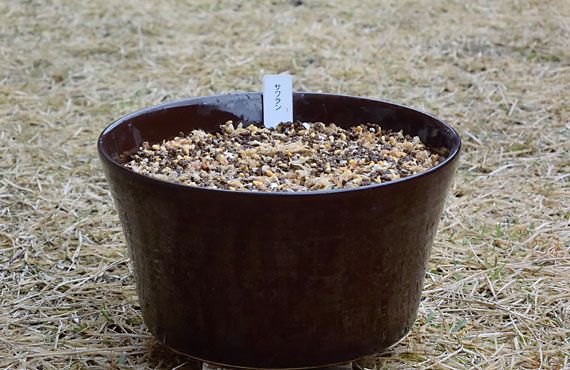 その正常品6個の植え付けに当り、用意したポットは昨年よりざっと2倍となる5号陶鉢を用意しました。昨シーズン中にバルブは分化して2倍に増えていました。”捕らぬタヌキ”的な話になりますが、今年も同程度に増えたとしても、もう1年は耐えられるサイズです。用土は微粒の山野草用配合土に3割ほどミズゴケを細かく刻んだものを混ぜて使用しました。下画像が植え付けを完了した様子です。