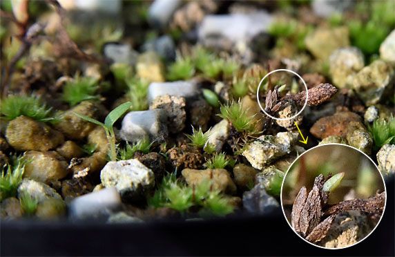 その一方で昨年秋口には2芽あった株のうち、もう一方の個体はいつまで経っても一向に芽吹きせず、こちらはダメだったか、などと諦めかけていました。ここに来て、その諦めかけていた方にも芽吹きが始まり、全員無事に2年目の活動を開始したことが確認できました。下画像がその様子ですが、何分にも10倍ルーペでやっと確認できるサイズなので、拡大した様子を円内に添付しました。