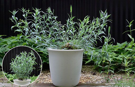 それにつけても、茎が四方八方に伸び放題に伸びているのは困ったものです(下画像)。茎と葉っぱの広がりはポットのサイズの3倍に達するかという勢いです。このままでは周囲のポットにも影響が及びかねず、この際タガを嵌めて茎の広がりをポットのサイズ相当に抑え込むことにしました。措置を施したAfter画像が下画像の円内ですが、茎の曲がり癖は収拾がつかず形はやや歪ですが、先端部の柔らかい部位は早い時期に補正される筈です。