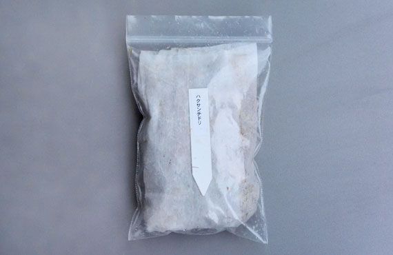 塊根を掘り上げてみると、親世代の塊根と 抱き合う形 で出てきました。親世代の方は黒く変色が始まっています。新世代の方には冬芽が既に発生していますが、根はまだ生成されておらず、今も親から養分の補給を受けていた様です。取り敢えず新旧世代をこのままの形で保存することにしました。湿らせたミズゴケに包み、このミズゴケが崩れない様、耐水性の紙で包んでジッパー付きポリ袋に収め(下画像)、冷温庫に収容しました。月が変わる頃には親世代は腐敗が始まると思われるので、その頃に一度開封して親世代を分離・廃棄する必要があります。