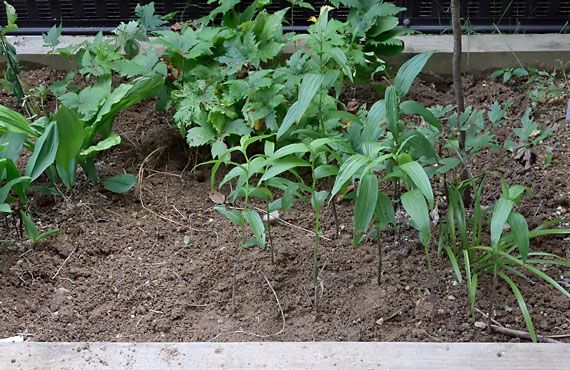 梅雨の雨で土壌が柔らかくなっていたため、作業の方は比較的楽に進みました。網目状の根っこの方は・・・というと、ホタルブクロの方は小は糸状の小さいものから、割り箸サイズまで縦横に走り回っていました。もう一方のドイツスズランは大きいところは大人の小指ほどもある根茎(?)が他の品種の根回りだろうとなかろうと、ところ構わず這いまわっています。これを駆除するために、やむを得ず被害側の株を一旦抜き上げざるを得ない場面もあって、結果的に植え替えてしまうものも出てしまいました。下画像がアフター画像ですが、かなりスッキリしたし、空地も捻出できました。