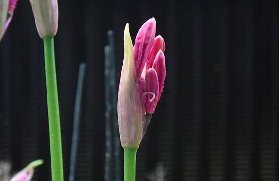 球根が分球してすぐに花芽を立ち上げたものの、小さな球根では養分の供給が追い付かずこの様な立ち枯れ状態に陥ったのか、或いは何かの病気か、などと推測を重ねているのですが、いずれとも断定に至る証左は見い出せていません。すでに5本の花芽がこの症状で退場してしまいましたが、これ以上、この症状が広がらないことを願うばかりです。