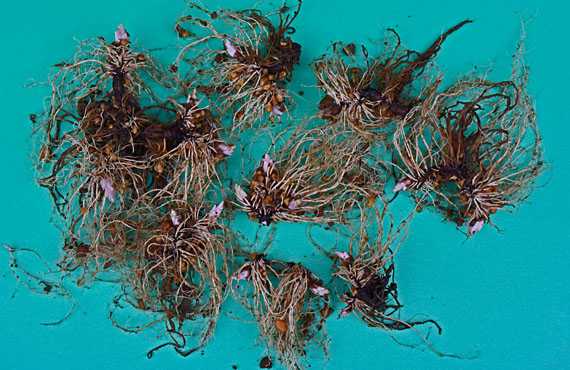 ということで最初に取り出したのは「鹿島」の7号ポット(上画像)です。これを掘り返して塊根を取り出した様子が下画像です。個体数は昨年の手入れ時と比べて1.5倍ほどに増えていました。全てを元のポットに植え戻すと甚だしい過密となるため、一部は残して里子に出すことにします。