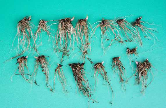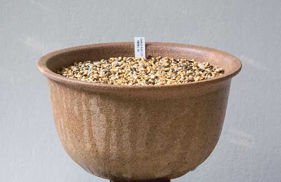 ポットを裏返して一叩きしただけで、個体数の激増が明らかになりました。昨年植え替えた時と比べて軽く2倍を超える増え様です。下画像が全個体を掘り上げた様子ですが、過密に陥ってしまったせいか、個々の冬芽の大きさはかなりバラついています。半数弱の小さな冬芽にはツボミを生成する力はないかもしれません。そうした事情は横に置いて、これらを植え戻さなくてはいけません。これまでの5号ポットでは収容しきれません。ポットを一回り大きな7号に変更して植え付けることにしました。 こちら が新居に落ち着いた状態です。