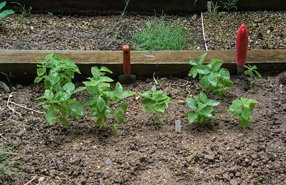10株近くが芽吹いた上画像のポットから、まず個体を掘り上げます。塊根は複雑に絡み合っていて、分割にはかなり骨が折れましたが、何とか9個に分割しました。面接による一次選考の分かれ目が こちら です。株元の茎が茶色に染まったもの(泥軸)と普通に緑色のもの(青軸)にふるい分けし、見守って行くことになります。過去に複数色に咲き分けたのは、いずれも泥軸の個体だったことが出発点です。これらを露地の一角に植え付けるところまでが、今回の仕事です(下画像)。ふるい分けが完全に終わるまで2~3年かかるかと思いますが、それで必ず目的のスペックを満たすものが見つかるかどうかは分かりません。